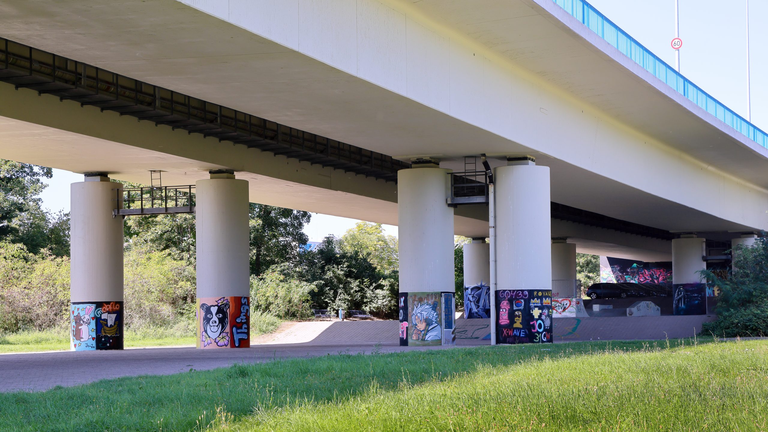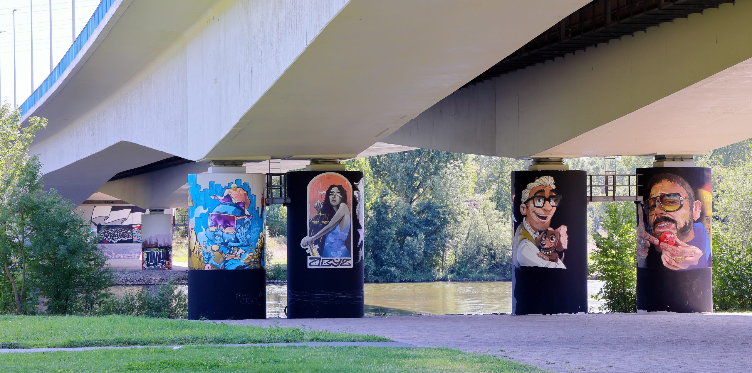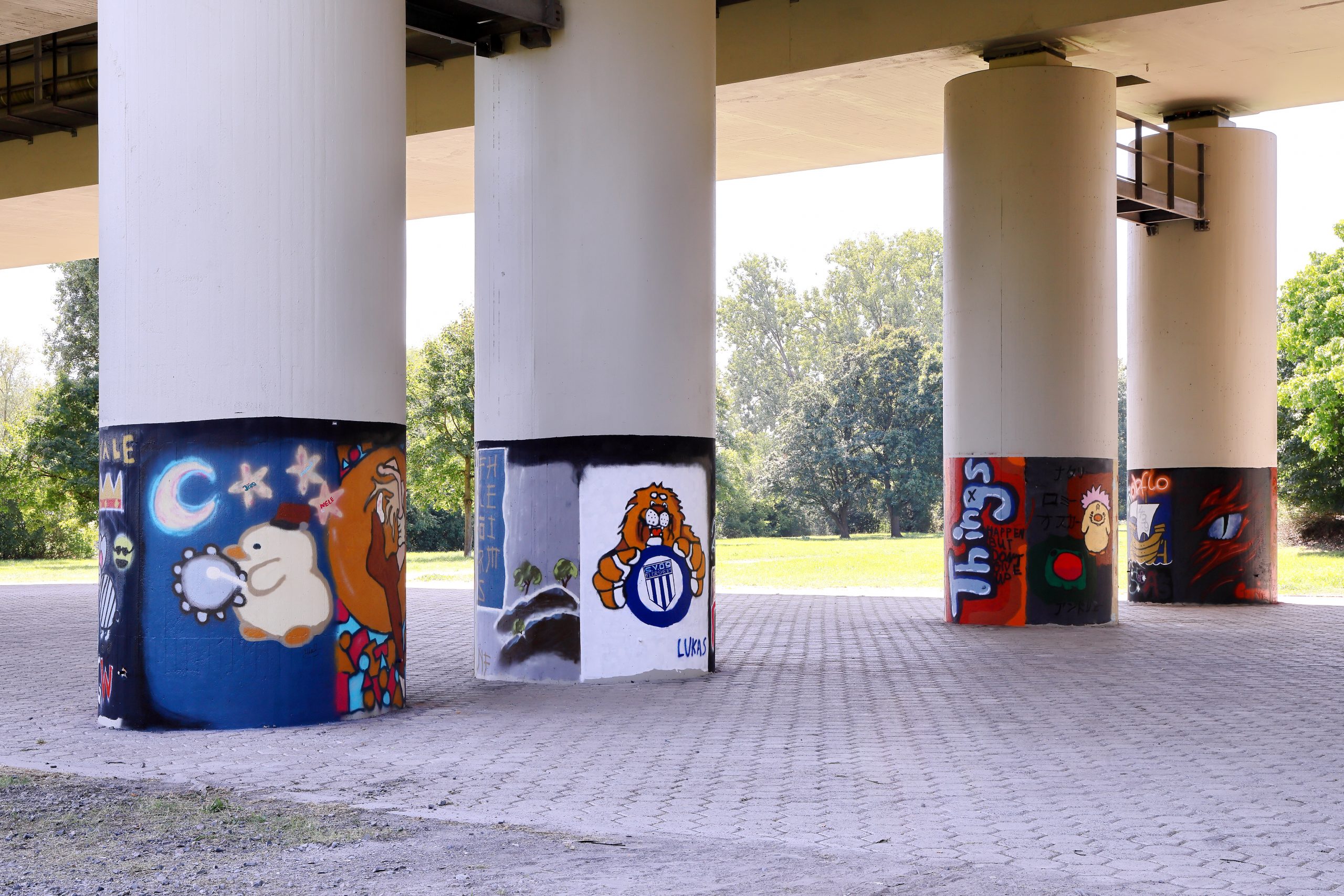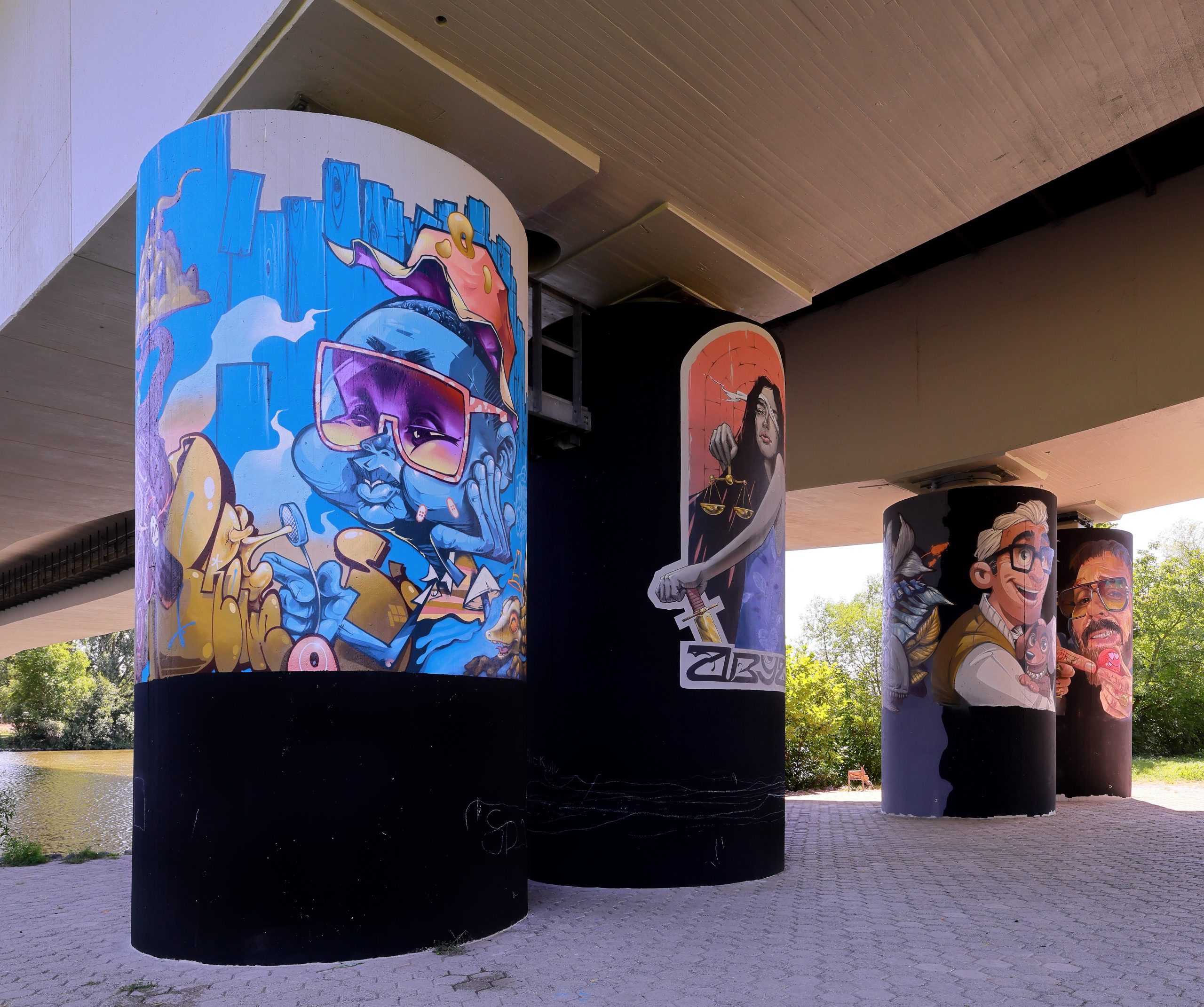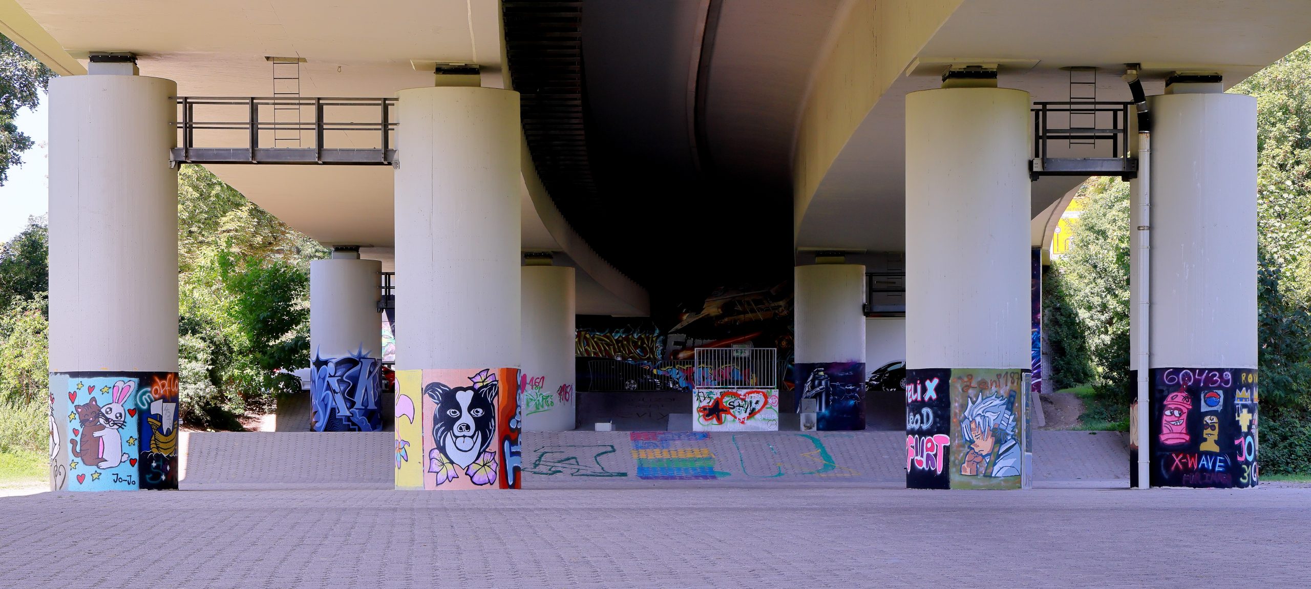 In Flörsheim ist ein solcher (Un)Ort durch Streetart aufgewertet worden. 8 Pfeiler der Opelbrücke sind in einem Kooperationsprojekt von Stadt und mobiler Jugendberatung farblich neugefasst worden.